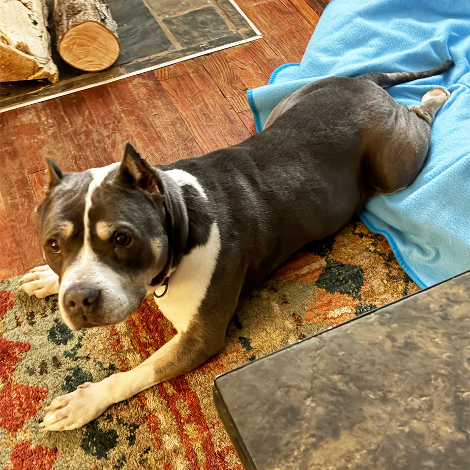 She has weakness in her hind legs which results in an inability to walk straight, wobbling and stumbling when she walks, but this doesn’t stop her! She gets zoomies and when she gets moving quickly she bunny hops with her back legs. She needs a sling to help with stairs but can get around without it. She also has a wheelchair for long walks.
